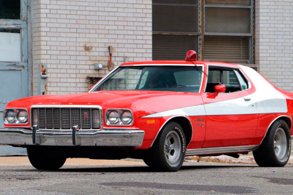Ford Gran Torino con livrea rossa e striscia bianca, un mito anni '70 della serie tv Starsky & Hutch, una serie poliziesca americana che ha com...